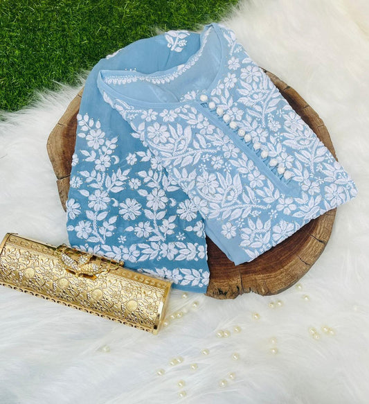 Blue Elegant Viscose Chikankari Work Kurti with 3D Fine Chikankari Handwork