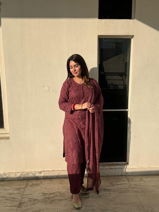 Brick Red Lucknow Chikankari Hand Work Dobby Cotton Tone-to-Tone 3-Piece Co-ord Palazzo Set with Chiffon Dupatta