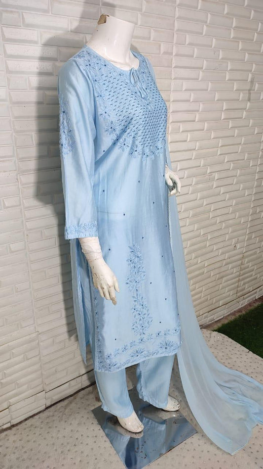 Blue Lucknowi Chikankari Rayon Kurti and Palazzo Set with Chiffon Dupatta