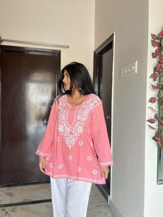 Peach Handcrafted Lucknowi Chikankari Style Short Kurta & Palazzo Set