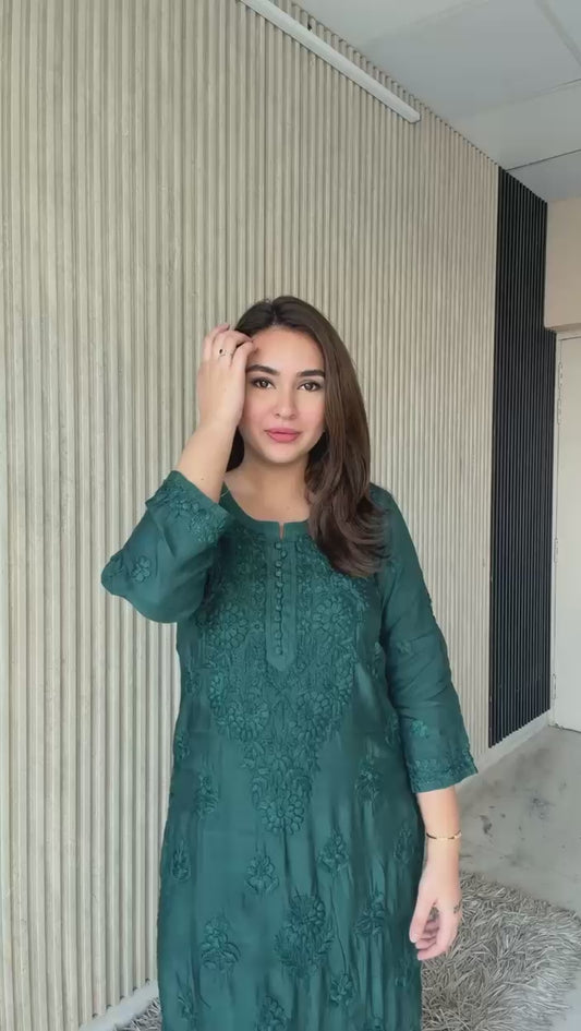 Dark Green Lucknowi Chikankari Anchor Thread 3D Work Muslin Kurta & Palazzo Set