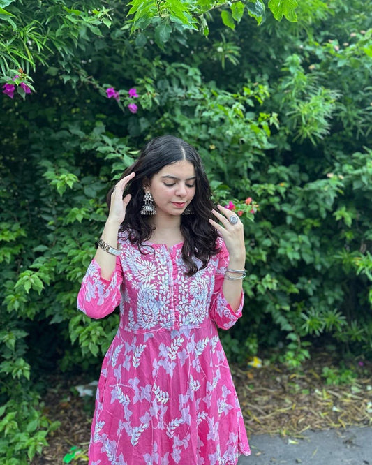 Dark Pink Lucknow Chikankari Whisper mul mul Cotton Angrakha Style Short kurti