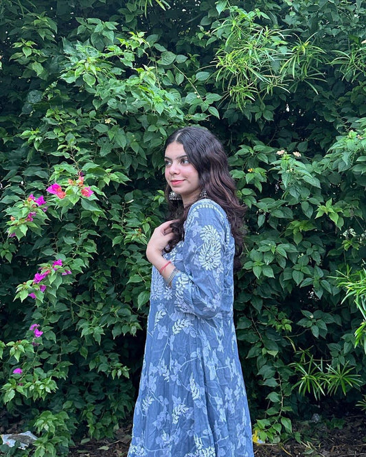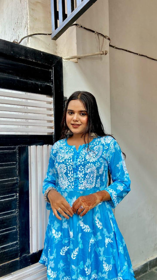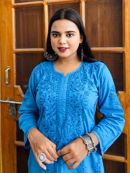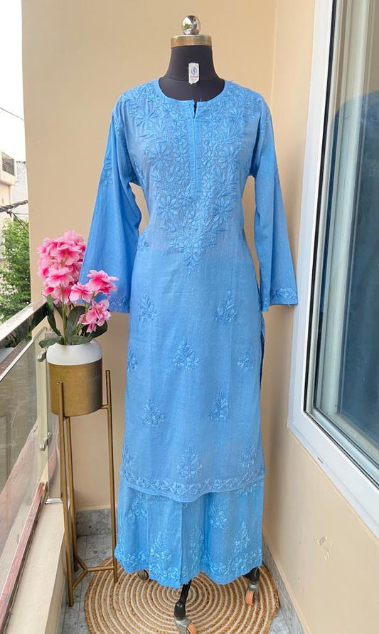 Aqua Blue Lucknowi Rose Elegance Chikankari Cotton Kurti & Coordinated Set ++ Sizes available