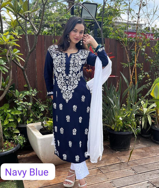 Navy Blue Elegant Lucknowi Chikankari Cotton Kurti 3 pc Set