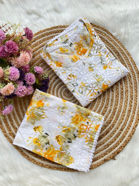 Yellow White Lucknowi Chikankari Mul Mul Cotton Kurti and Palazzo Co-ord Set
