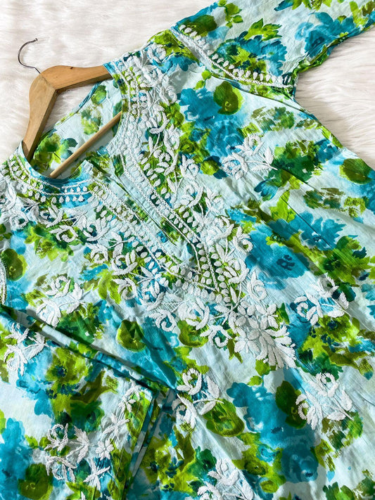 Blue & Green Floral Elegance Mul Mul Cotton Pallazo Coord Set