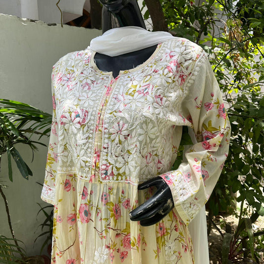 Light Yellow Mul Mul Aabroo Gowns Set| Kurti Set