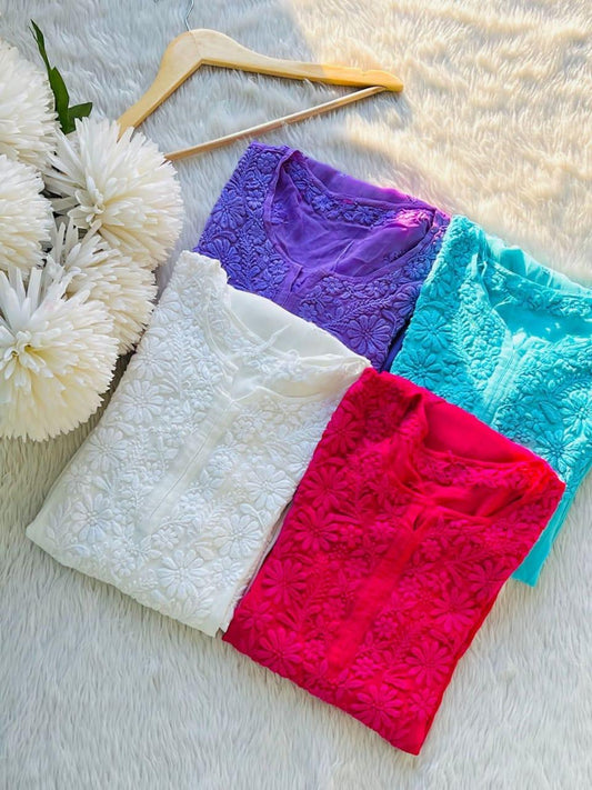 Explore the timeless artistry of Chikankari, a revered embroidery technique originating from Lucknow, India. With delicate threadwork adorning fine fabrics, Chikankari embodies elegance and tradition. Discover the intricate beauty of Chikankari Embroidery, meticulously handcrafted by skilled artisans. From graceful Chikankari Dresses and Kurtis to opulent Sarees and Lehengas, each garment tells a story of heritage and craftsmanship. Elevate your wardrobe with Chikankari Suits and Tops, perfect for both formal affairs and everyday wear. Immerse yourself in the allure of Chikankari Fabrics, from airy cotton to luxurious georgette, offering versatility and sophistication. Experience the timeless charm of Chikankari and indulge in its exquisite craftsmanship.