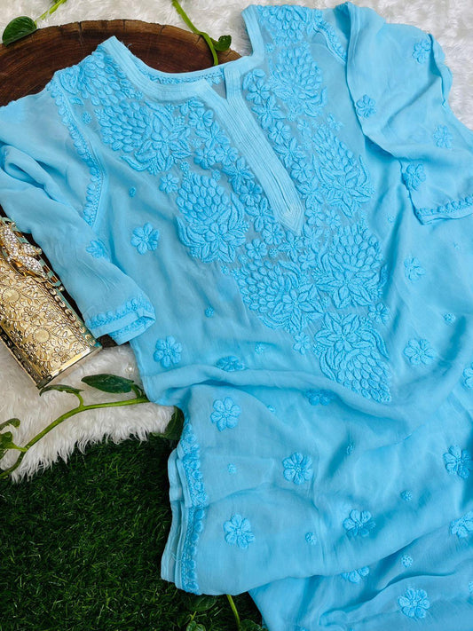 Light Blue Viscose Chikankari Kurti with 3-D Thread Handwork Embroidery Latest Online