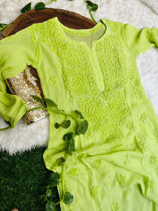 Light Green Viscose Chikankari Kurti with 3-D Thread Handwork Embroidery Latest Online