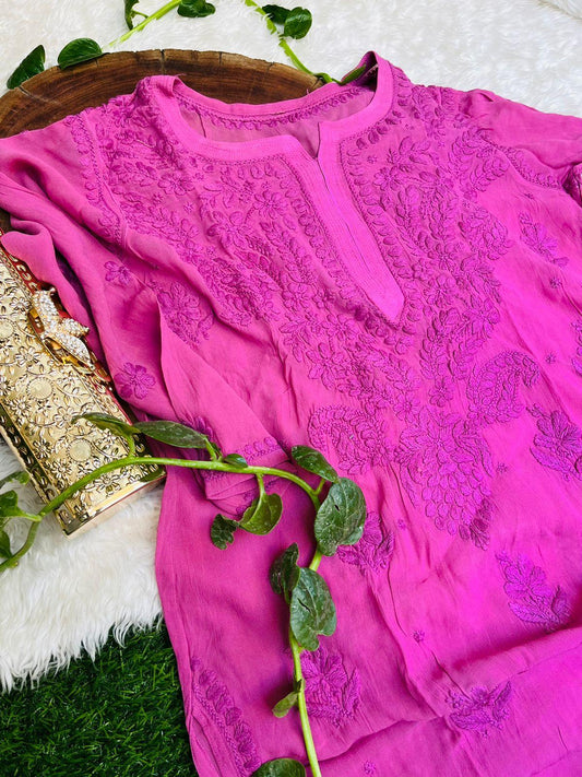 Magenta Pink Viscose Chikankari Kurti with 3-D Thread Handwork Embroidery Latest Online