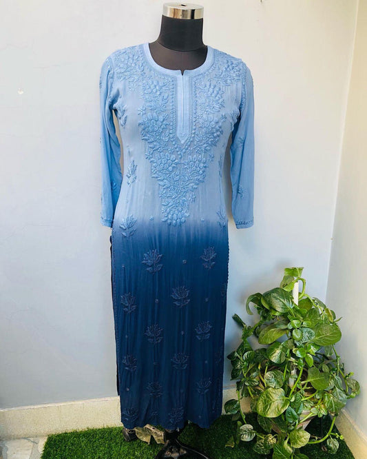 Ombre Blue Viscose Chikankari Kurti with 3-D Thread Handwork Embroidery Latest Online