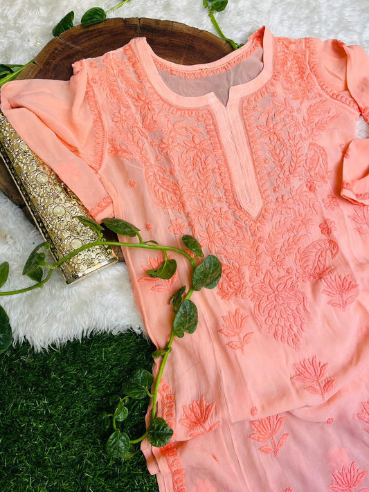 Peach Viscose Chikankari Kurti with 3-D Thread Handwork Embroidery Latest Online