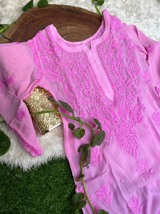 Ombre Pink Viscose Chikankari Kurti with 3-D Thread Handwork Embroidery Latest Online