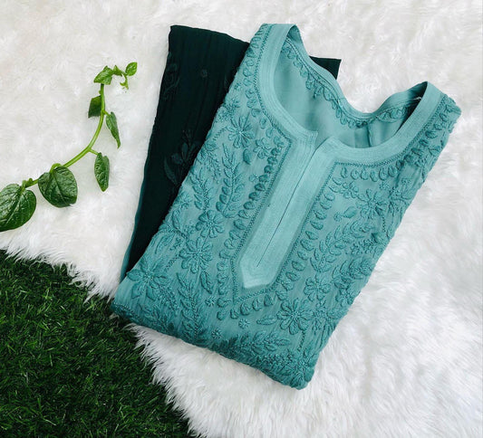 Teal Blue Viscose Chikankari Kurti with 3-D Thread Handwork Embroidery Latest Online