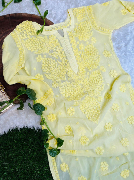 Light Yellow Chikankari Sequins Kurti with Handwork Embroidery Latest Online