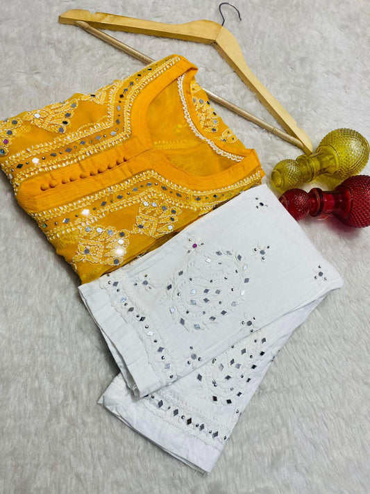 Amber Yellow Lucknowi Georgette Chikankari Mirror Gala Buti Kurti Latest Online