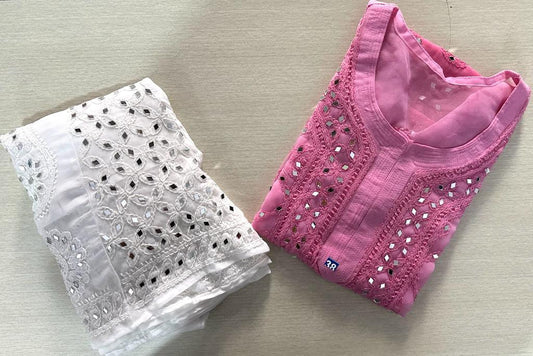 White Lucknowi Georgette Chikankari Mirror Gala Buti Kurti Latest Online