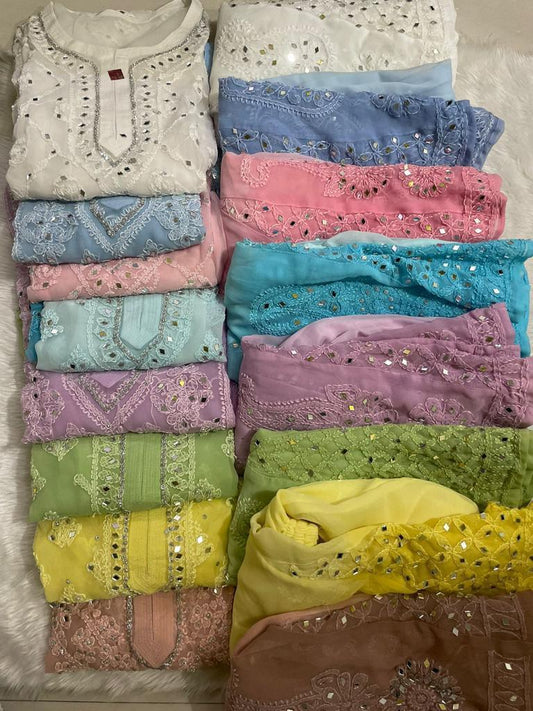 Orange Lucknowi Georgette Chikankari Mirror Gala Buti Kurti Latest Online