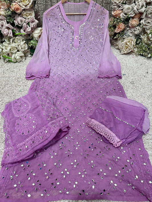 Dusty Pink Gradient Mirror Work Chikankari Kurti Sharara Dupatta Set