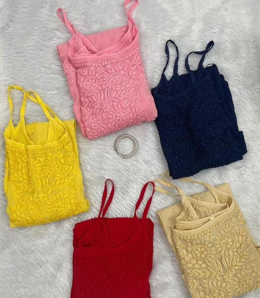 White Viscose Strappy Chikankari Handwork Short Kurti , Viscose Sharara, Chiffon Dupatta