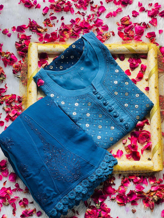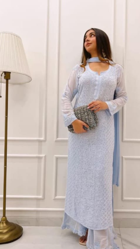 Sky Blue Elegant Viscose Lucknow Chikankari Handwork Ensemble (New)
