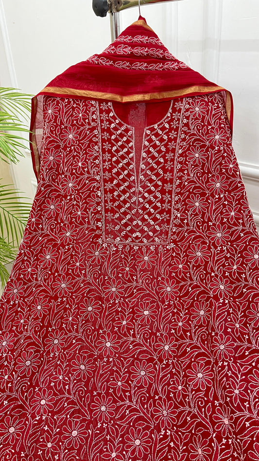 Red Premium Front Jaal Collection Pure Mul Chikankari Suit Set