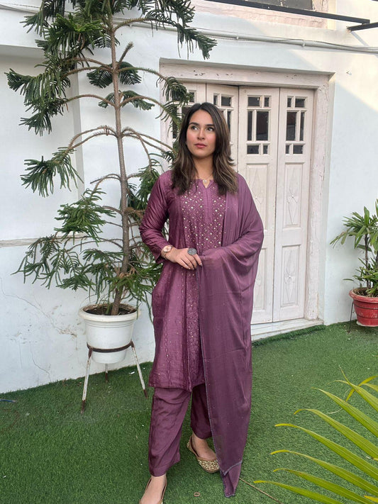 Wine Chikankari Ensemble: Chikan Kurti, Lucknawi Afghani Salwar, and Sequined Duppata Set