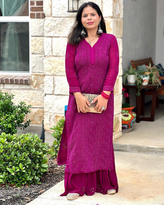 Wine Luxe Chikankari Bliss: Premium Viscose Set with Sharara