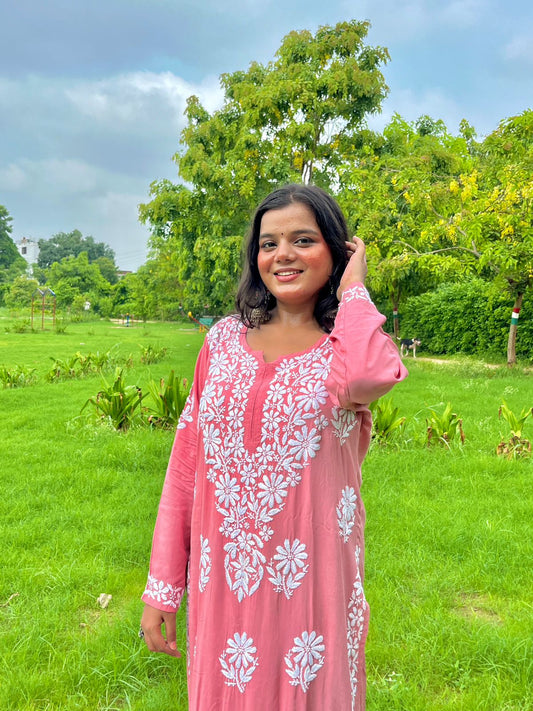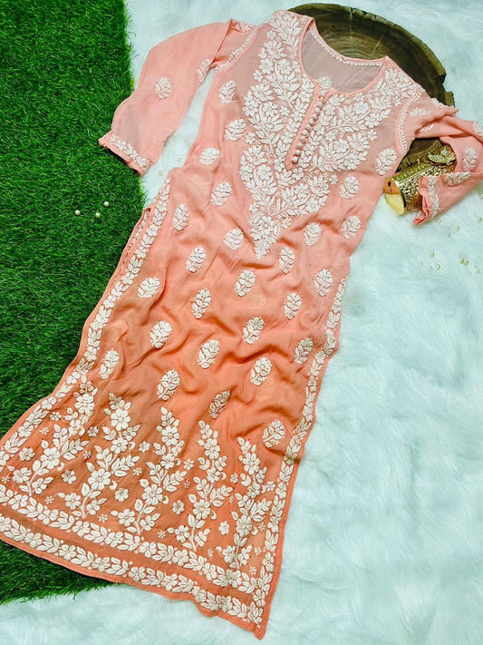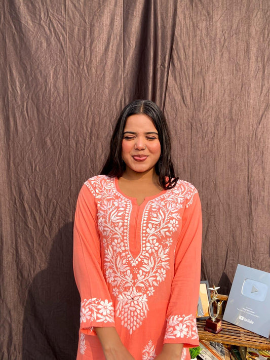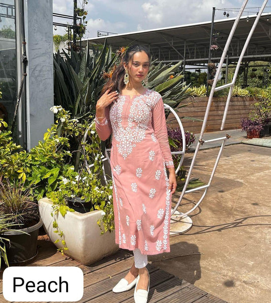 Peach Elegant Viscose Chikankari Work Kurti with 3D Fine Chikankari Handwork