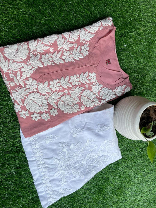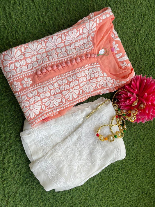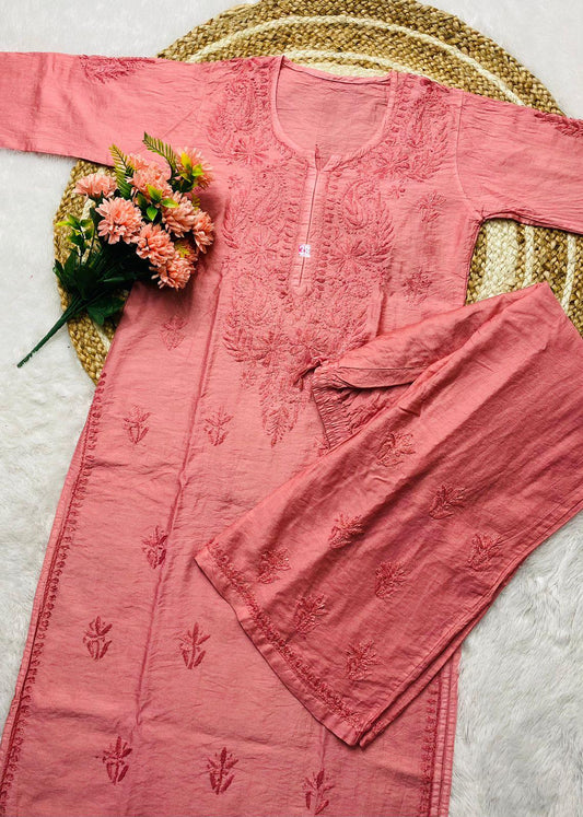 Peach Beautiful 3D Viscose Lucknow Chikankari Work Kurti and Pallazo