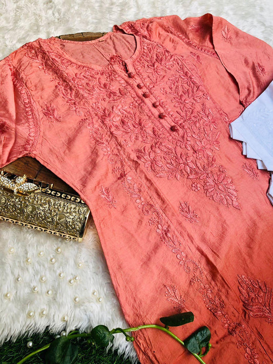Peach Lucknowi Chikankari Beautiful Premium Chanderi Resham Work Kurti