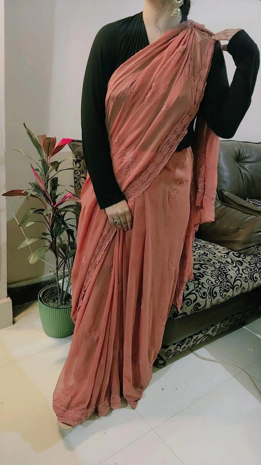 Peach Elegant Chikankari Georgette Saree with Black Blouse Perfect for Bridesmaids