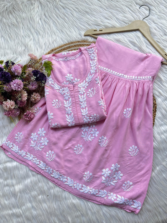 Pink Premium Heavy Lucknow Chikankari GULAB Modal Kurti with Handwork Lycra Pant