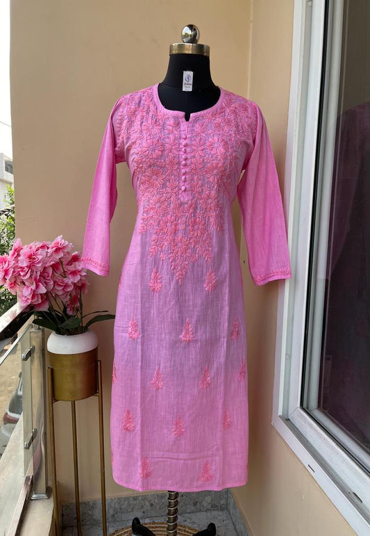 Dark Melon Pink Cotton Chikankari Hand Work Kurti Suits Online