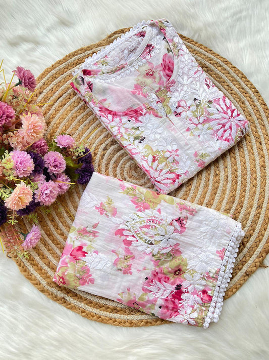 Pink White Lucknowi Chikankari Mul Mul Cotton Kurti and Palazzo Co-ord Set