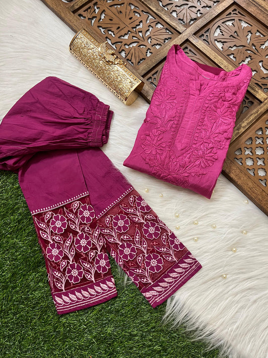Pink Premium Rayon Kurti with Palazzo Set Lucknow Chikankari Handwork