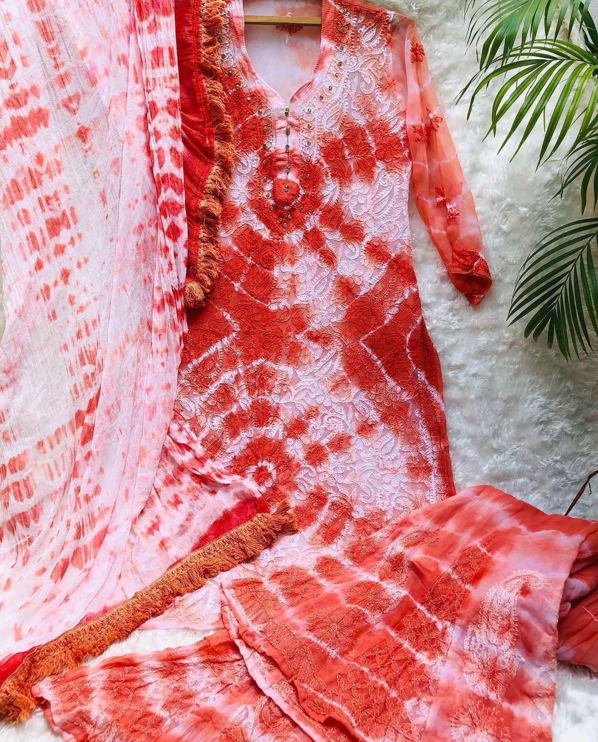 Mirage Ensemble: Peach Georgette Chikankari Kurti, Sharara, and Dupatta Set with Tye & Dye and Zerkan Sparkle