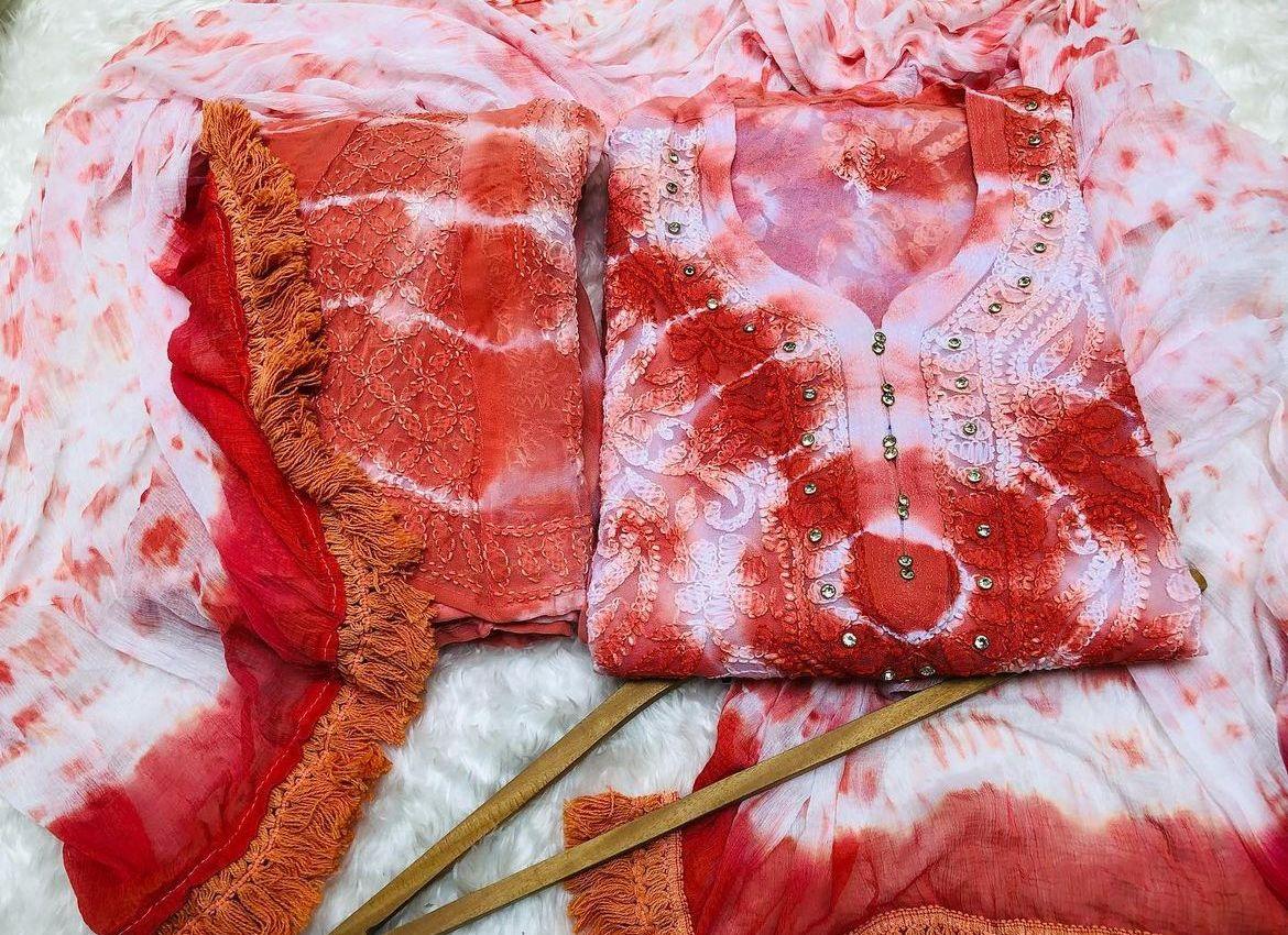 Red Radiant: Lucknawi Georgette Chikankari Mirror 56 Kali Set