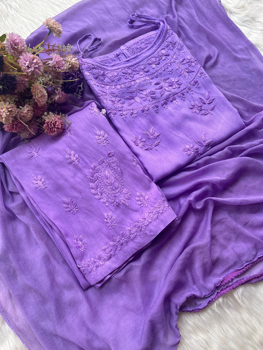Lavendar Handcrafted Lucknow Chikankari Noodle Strap Kurti with Plazo & Dupatta Set