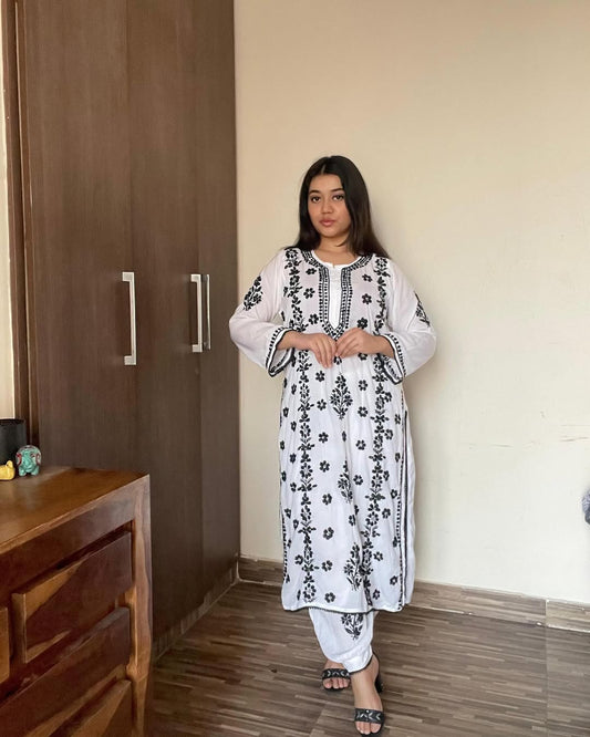 Premium Black Lucknow Chikankari Modal Kurti with Afghani Pant ā Hand Embroidered Elegance