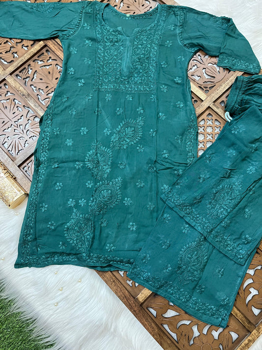 Teal Green Premium Rayon Chikankari Kurti Palazzo Set ā Lucknowi Handwork | Sizes 36ā48