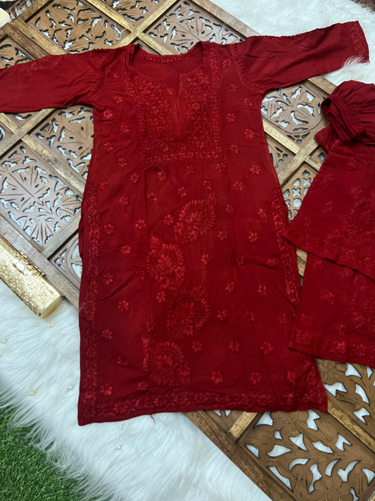 Maroon Premium Rayon Chikankari Kurti Palazzo Set ā Lucknowi Handwork | Sizes 36ā48