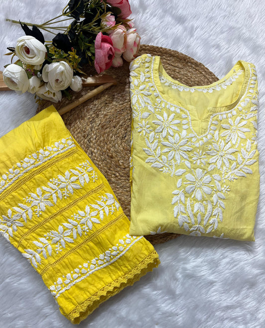Yellow Lucknowi Chikankari Plus Size Premium Rayon Short Kurti & Pallazo Set ⨠(Upto 6 XL)