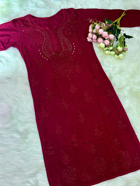 Deep Red Elegant Lucknowi Chikankari Rayon Mukaish Kurti & Pallazo Set ✨ (Up to 5XL)
