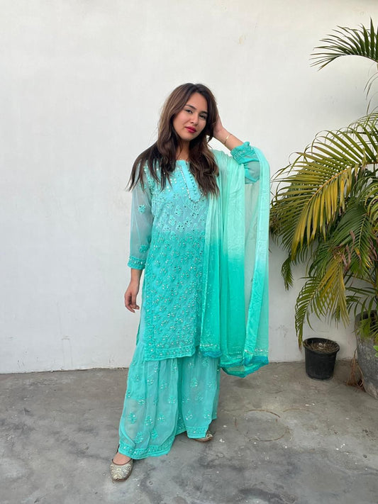 Aqua Green Chikankari Elegance Ombré Mirror Booti Jaal Set - Kurti, Sharara ,Dupatta & Inner