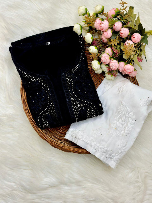 Black White Beautiful Super Georgette Kantha Work Suits Stitched