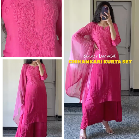 Rani Pink PLUS SIZE PREMIUM Lucknow Chikankari Handcrafted Rayon Kurti & Palazzo Set