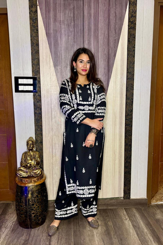 Black Lucknowi Chikankari Ghas Patti Handwork Dobby Cotton Kurti Palazzo Set with Lace and Kureshiya Buttons