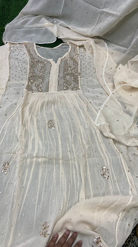 White Gold Premium Party Wear Lucknow Chikankari Kurta Set with Teeki Fardi & Mukesh Work